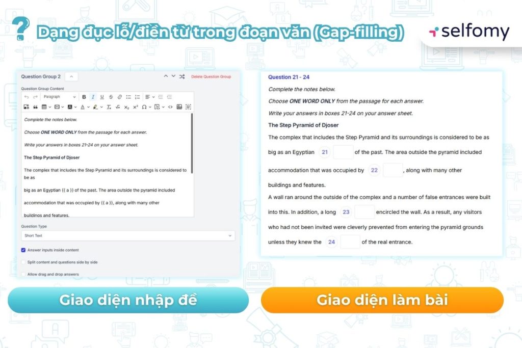 Dạng đục lỗ/điền từ trong đoạn văn (Gap-filling): Yêu cầu học viên điền từ chính xác vào khoảng trống trong đoạn văn hoặc tóm tắt.