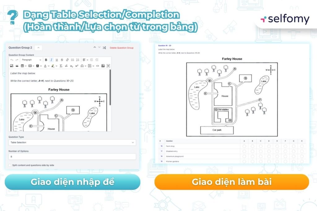 Table Selection/Completion (Hoàn thành/Lựa chọn từ trong bảng): Học viên cần chọn hoặc điền từ vào ô trống để hoàn thành một bảng dữ liệu hoặc sơ đồ. Tính năng này mô phỏng chính xác giao diện nhập liệu, giúp học viên tránh mất điểm vì lỗi chính tả.