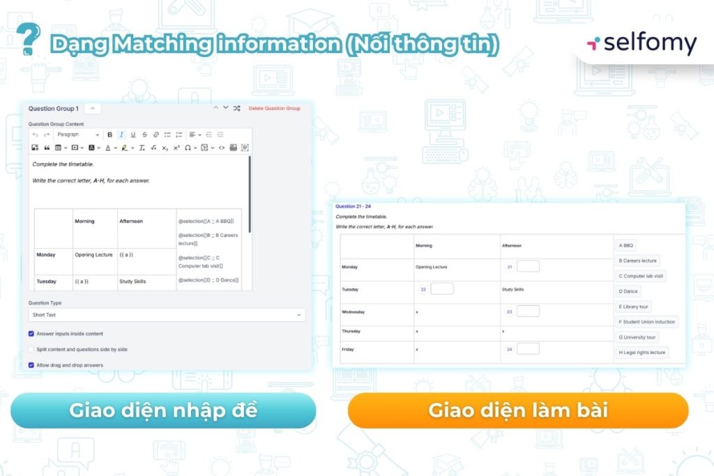 Dạng Matching information (Nối thông tin/Sự kiện): Yêu cầu học viên nối một danh sách các thông tin/danh mục với các mệnh đề hoặc sự kiện tương ứng. Giao diện trên Selfomy One cho phép học viên thao tác kéo thả hoặc chọn đáp án một cách trực quan, mô phỏng trải nghiệm thi thật.