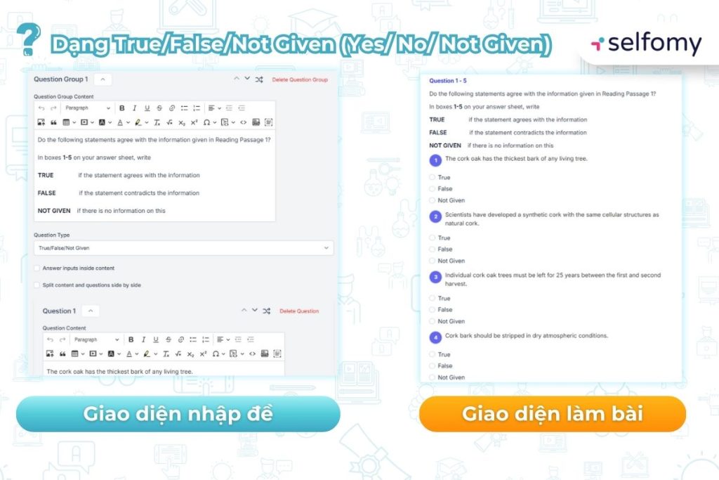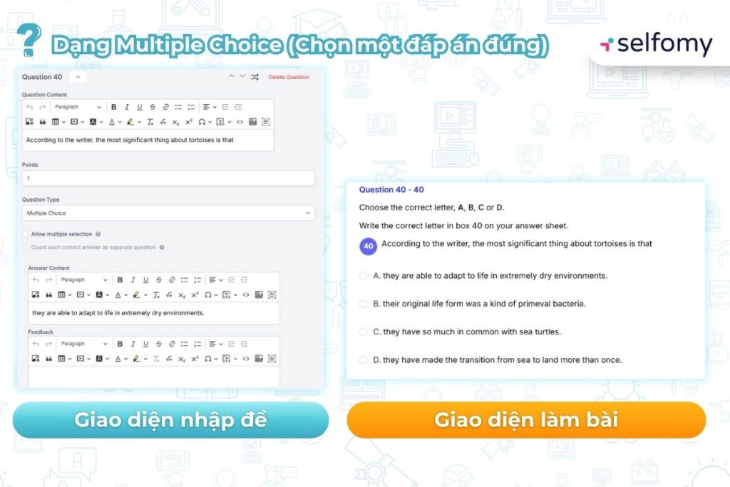 Đừng để học viên của bạn bước vào phòng thi với tâm lý bỡ ngỡ chỉ vì thiếu công cụ luyện tập chuẩn mực. Hãy để Selfomy One trở thành nền tảng LMS tích hợp AI giúp trung tâm bạn nâng cao chất lượng đào tạo và xây dựng lợi thế cạnh tranh áp đảo.Để bắt đầu ngay lập tức, đội ngũ Selfomy đã chuẩn bị tài liệu hướng dẫn chi tiết về cách nhập đề, tối ưu hóa các dạng câu hỏi mới trên nền tảng tại: Tạo đề kiểm tra, hướng dẫn nhập đề IELTS